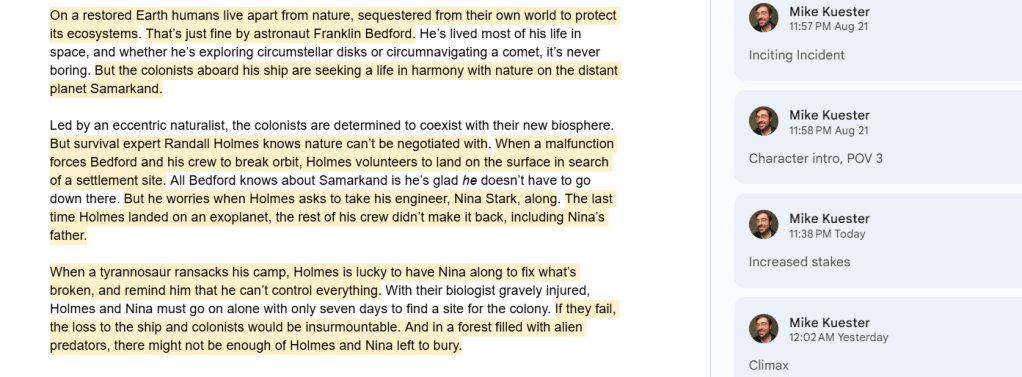Like I said at the beginning, you only get a few sentences. And once the unofficial criteria are taken into account, the number of spare sentences drops to nearly zero. To make the most use of what I had, I began highlighting vital sentences that filled the criteria, labeling them “Character intro: POV 1”, “Establish stakes”, “inciting incident”, etc.